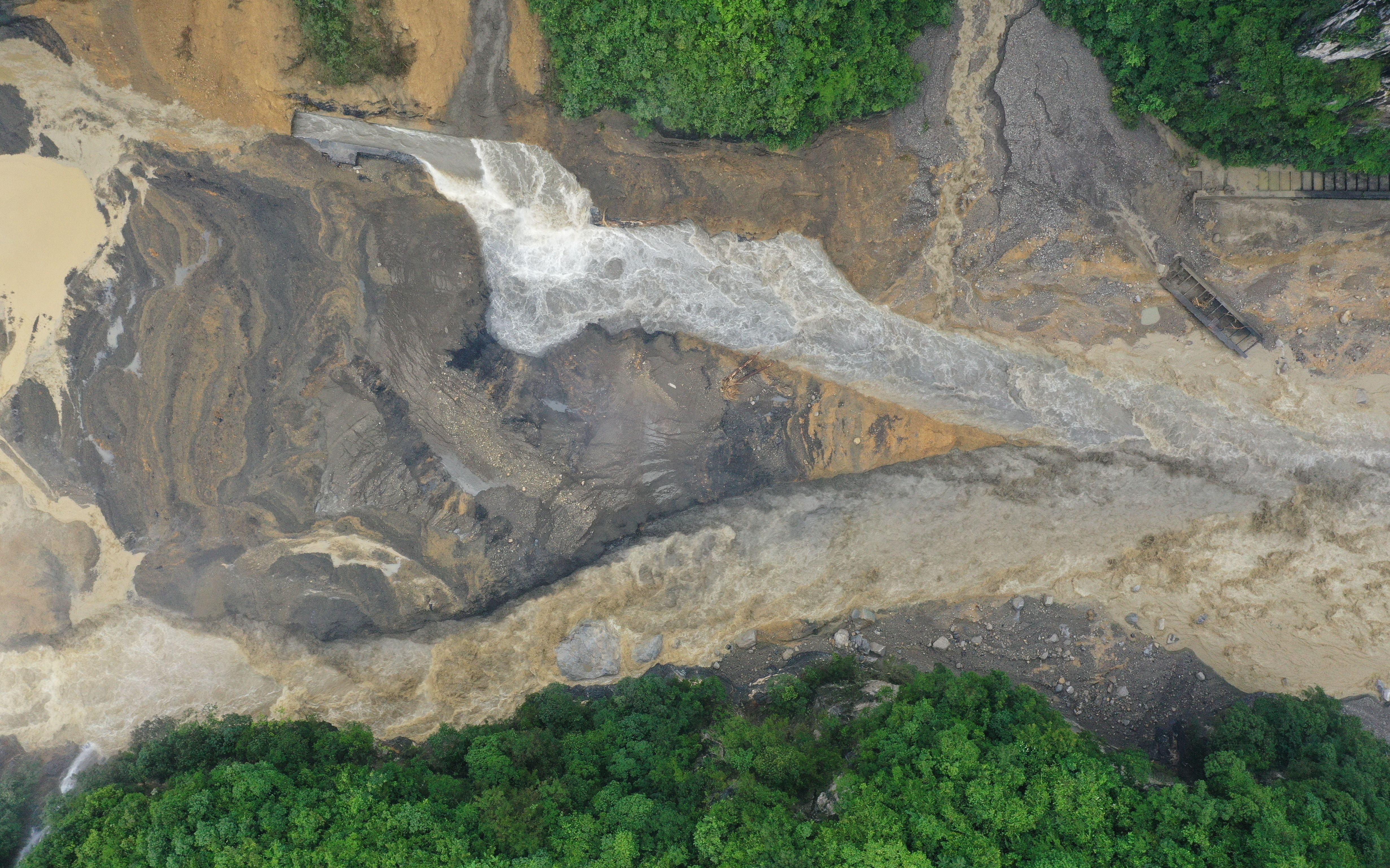 发布会通报称,堰塞湖形成后,当地采取紧急措施,加大了堰塞湖上游云龙河水库下泄流量,加上清江上游来水,冲开堰塞湖顶。从新京报记者7月22日航拍的照片中可以看到,在塌方体边缘,有一股水流从堰塞湖往下流。