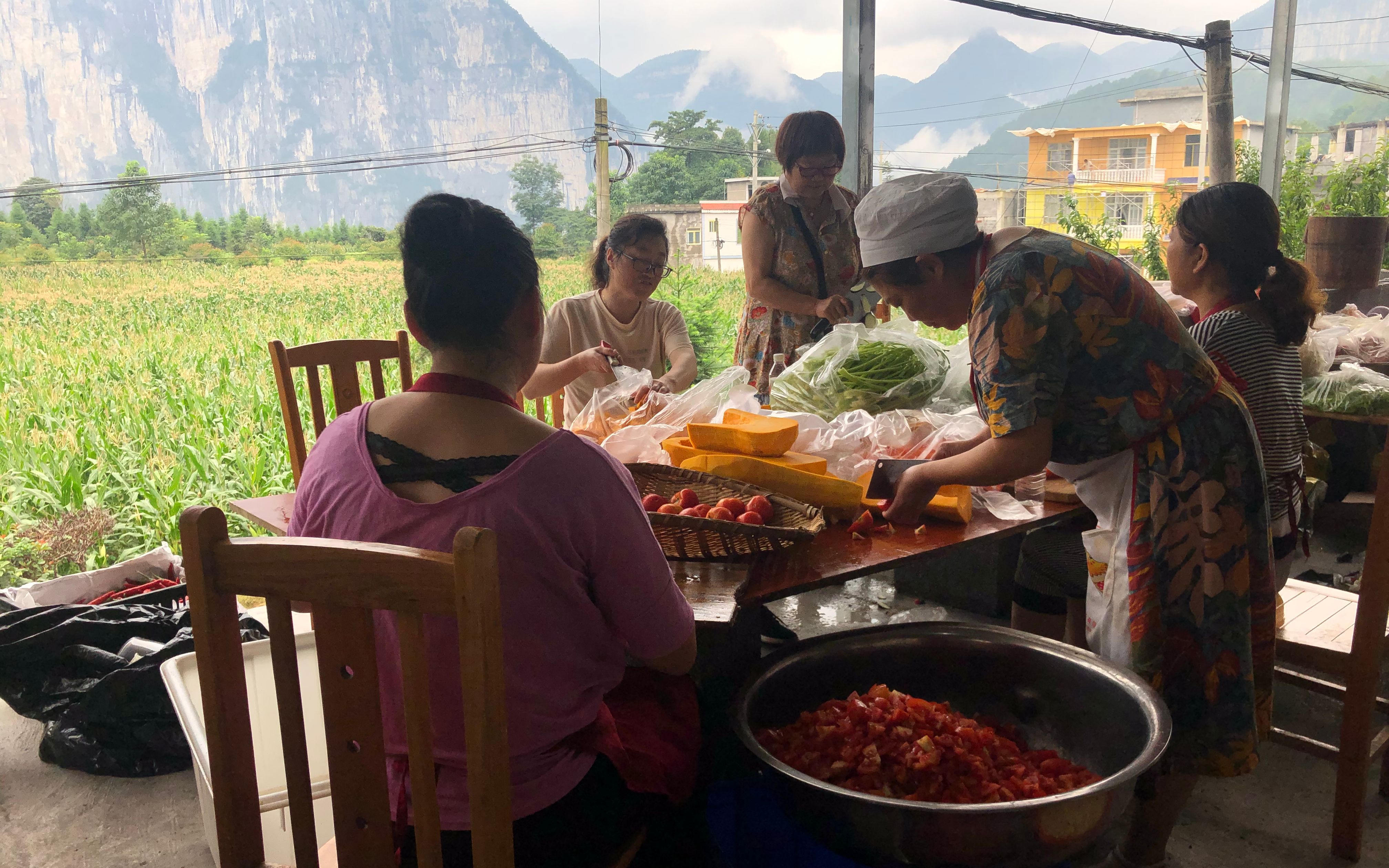 住在附近的妇女们赶来支援,从早上6点开始在厨房忙活,一直到晚上11点。从7月23日开始,有志愿者过来帮忙做饭,当地企业和附近村民还送来了不少蔬菜和米面。