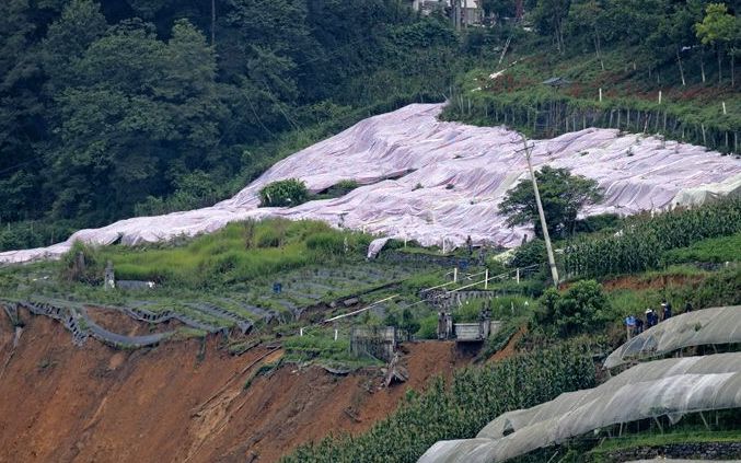 7月23日,工作人员在滑坡地段上方铺上油布,防止出现新的滑坡。新京报记者 陶冉摄