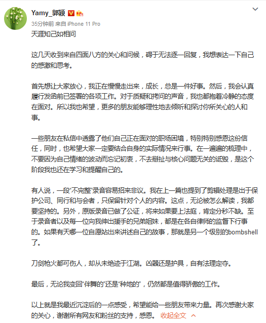 新京报讯 7月27日,前火箭少女101队长Yamy(原名 郭颖)在社交媒体上再次回应了侮辱录音事件,她称,“有人说,一段‘不完整’录音容易招来非议。我在上一篇也提到了剪辑处理是出于保护公司、同行和与会者,只保留针对个人的内容。这点,无论被怎么解读,我都要坚持的。另外,原版录音已做了公证,将来如果要上法庭,肯定分秒不缺。至于录音者以及每一位向我伸出援手的兄弟姐妹,都是在各自律师的监督下行事的。”