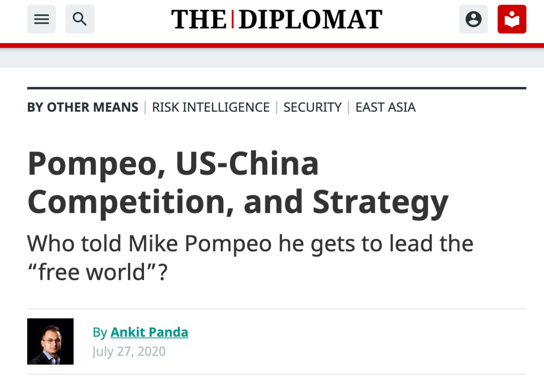 新京报讯(记者 李碧莹)近日,一篇发表在国际时事杂志《外交官》网站,名为《蓬佩奥、中美竞争与战略——谁告诉迈克·蓬佩奥他可以领导“自由世界”?》(Pompeo, US-China Competition, and Strategy-Who told Mike Pompeo he gets to lead the “free world”?)的文章,以蓬佩奥的演讲为分析案例,说明美国对华政策为何是失败的。作者认为这种仅仅是为了与中国竞争而竞争,却不能说明为什么要竞争的做法,很难说服其他国家选择加入美国的阵营。