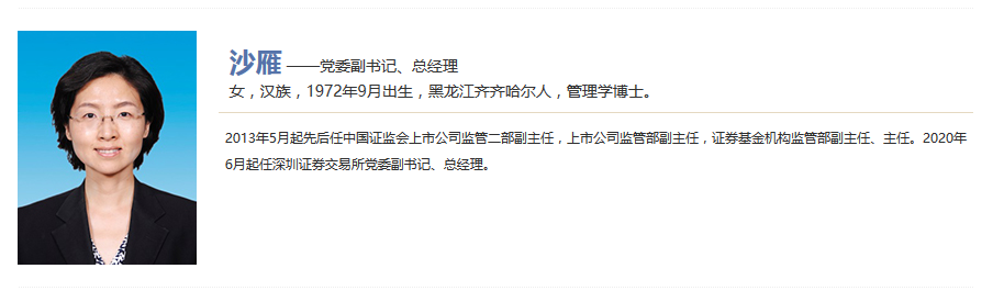 7月31日午间,深交所微信公众号发布消息称,近日,中国证监会党委决定,沙雁任深圳证券交易所党委副书记、总经理。