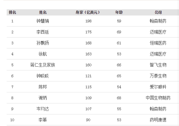 新京报讯(记者 张秀兰)8月4日晚间,福布斯中国发布医疗健康富豪榜TOP50榜,翰森制药董事会主席钟慧娟以198亿美元的身家名列榜首,迈瑞医疗联合创始人李西廷以175亿美元名列次席,钟慧娟的丈夫、江苏恒瑞医药集团实控人孙飘扬名列第三。