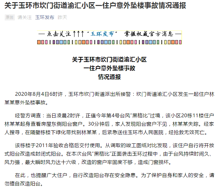 浙江玉环通报女子关窗被台风吹落坠亡:住户自行改造阳台