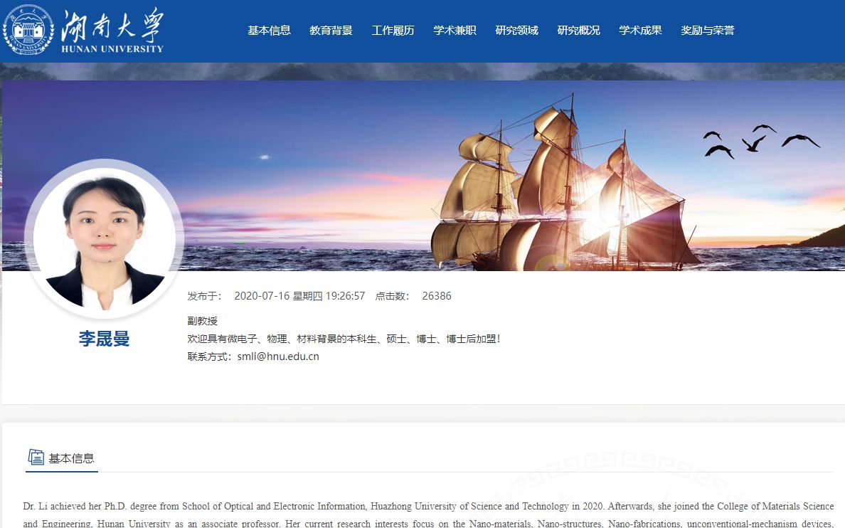 2015年获华中科技大学工学学士学位,同年硕博连读;2020年6月毕业,被华中科技大学授予工学博士学位;7月,被湖南大学材料科学与工程学院聘为副教授——这就是李晟曼的简历。