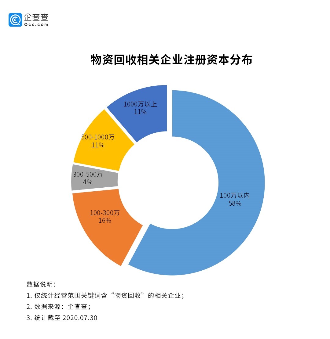 从注册资本分布来看,企查查数据显示,我国有过半的物资回收相关企业注册资本在100万之内,近20万家,占比58%,多为物资回收、销售相关企业。注册资本在500万以上的企业占比为22%。
