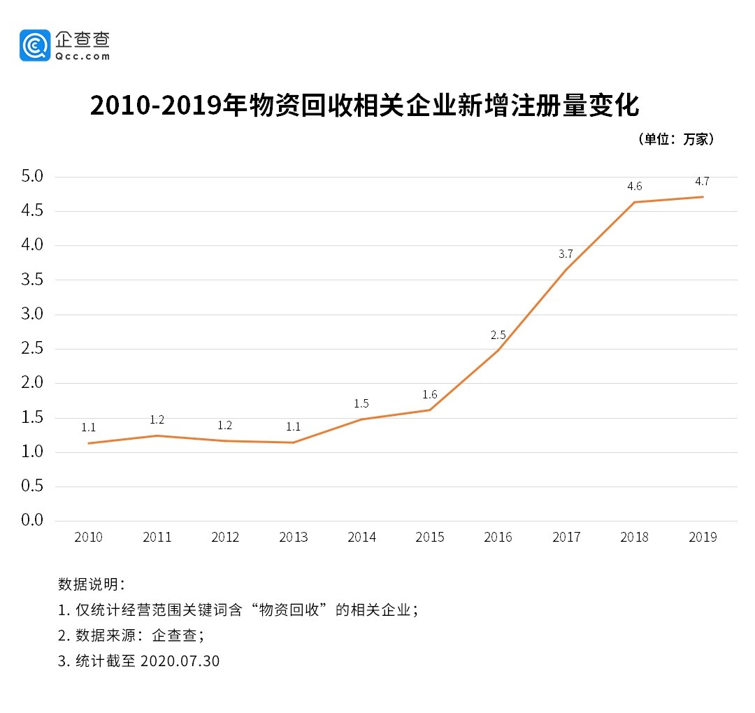 企查查数据显示,物资回收相关企业在近十年间发展中屡创新高。2010年-2015年间,物资回收企业每年都以1万-1.5万的新增数量平稳发展。2015年开始,随着经济的发展和“绿水青山”概念的政策实施,相关企业注册量直线上升。2016年是新增速度最的一年,该年注册量达到2.5万家,同比增长53.7%。2018年-2019年,注册量均超过4.5万家,其中2019年达到4.7万家,同比增长1.6%。