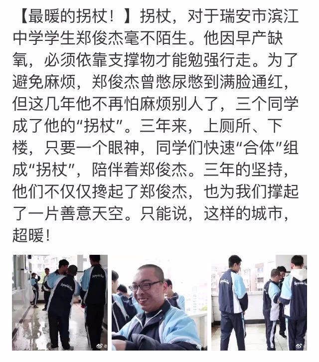 来自浙江省瑞安市瑞安滨江中学的九年级学生郑俊杰,因为患病自幼就无法行走,从升入中学的第一天,三名同班同学张仁俊、苏翔、沈智煌就成了郑俊杰的“拐杖”,三年如一日,放弃课间休息时间帮助同学。