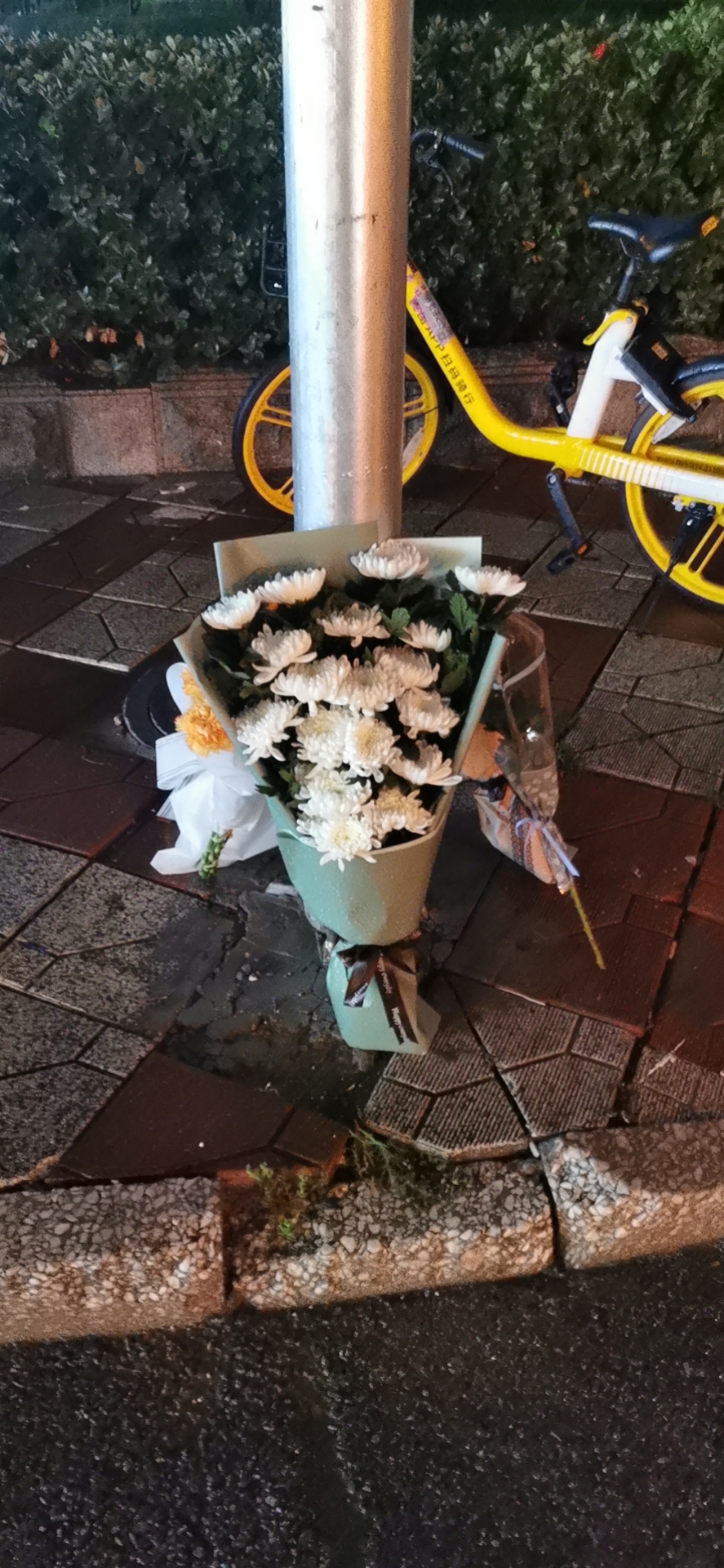 12日晚,当地市民在女孩遇难地附近摆放的菊花。受访者供图