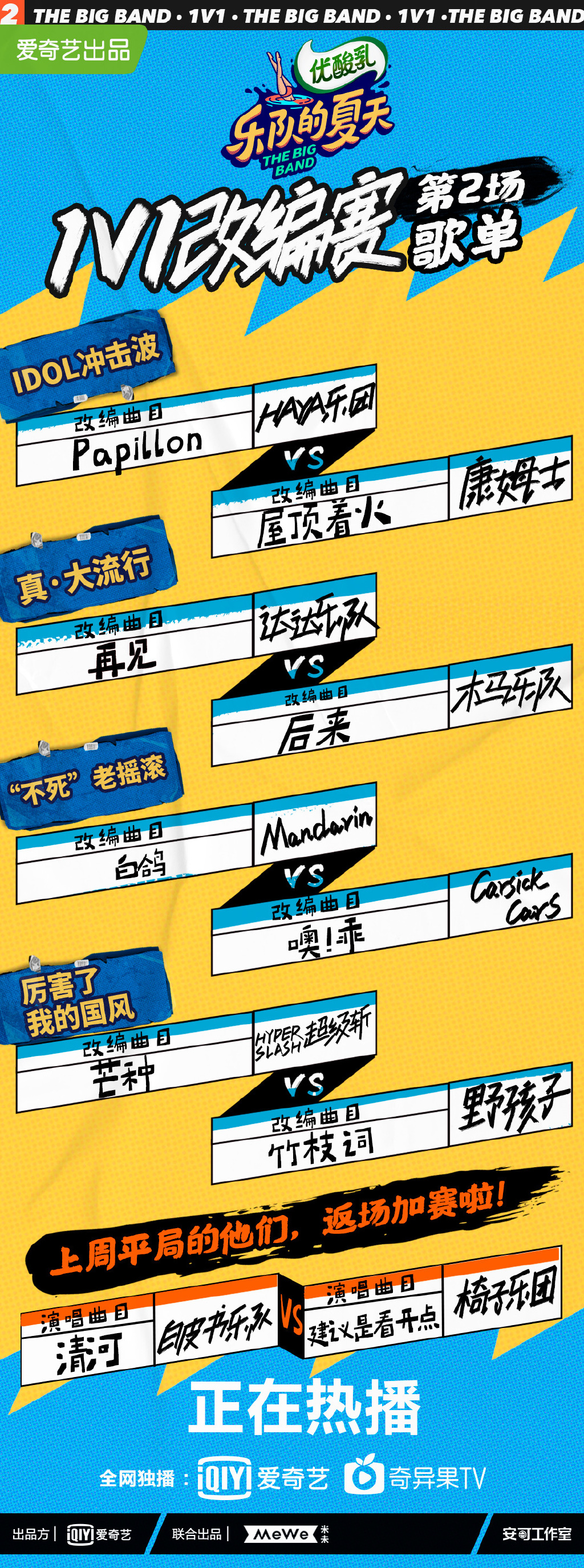 新京报讯 8月20日,《乐队的夏天2》在官方微博发布1V1改编赛第二场歌单。本期节目中的主题歌包分别为“IDOL冲击波”、“真·大流行”、“‘不死’老摇滚”、“厉害了我的国风”。其中包括不少经典老歌,例如《再见》(原唱张震岳)、《后来》(原唱刘若英)、《白鸽》(原唱伍佰)、《噢!乖》(原唱窦唯);也包括不少流行歌曲,例如《Papillon》(原唱王嘉尔)、《屋顶着火》(原唱宋茜)等。