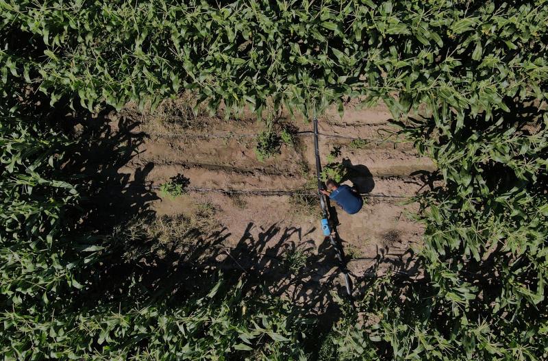关壮萨打开玉米地中的滴灌阀门。新京报记者 李木易 摄