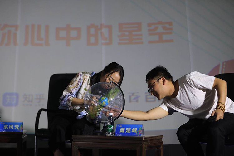 沙龙活动中,中国科学院国家天文台科普主管袁风芳和资深星空摄影师戴建峰在为观众找一颗南半球才能看到的星。