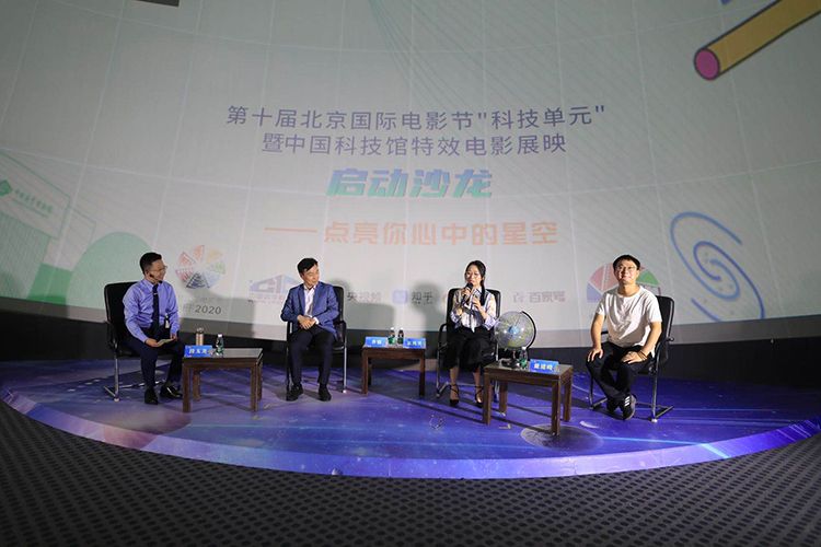 8月23日,“点亮你心中的星空”影迷沙龙活动在中国科技馆环幕影院举行,为第十届北京国际电影节“科技单元”暨中国科技馆特效电影展映拉开帷幕。今年的活动以云上共享、科普惠民为特点。图为:嘉宾与现场和直播间的观众一起探讨星空、星座、艺术创作与太空探索。