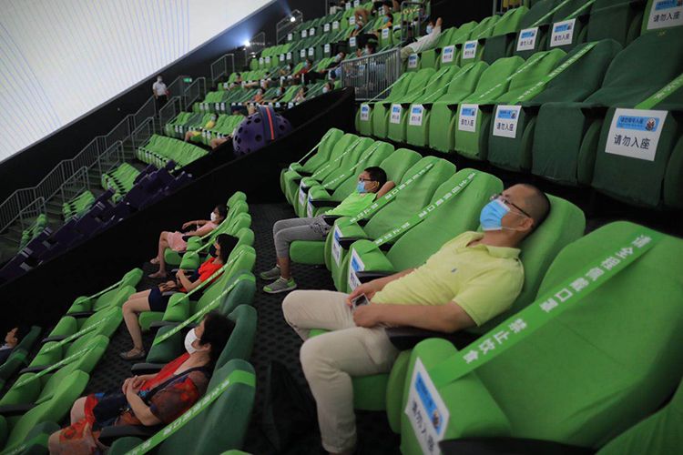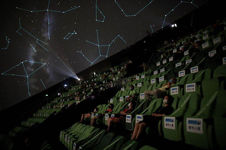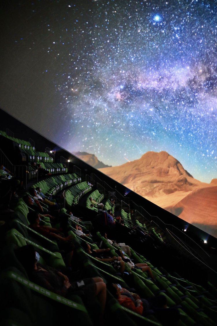 来到现场参加沙龙的星空爱好者,在环幕影院中保持安全距离就座。