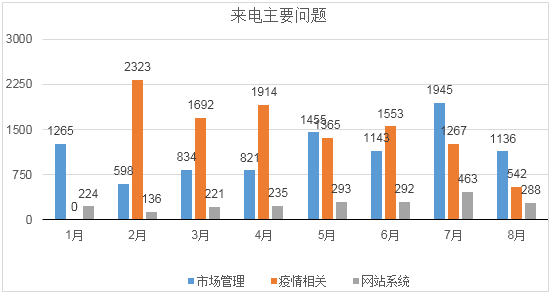 数据显示,1月、疫情整体情况好转后的5月以及新发地市场聚集性疫情结束后的7月,市场管理类来电问题占比较多;2月,因2月6日北京市推出“16条措施”,疫情相关来电和政策咨询量非常突出;4月17日“新九条”政策发布后,“16条措施”的咨询量减少,咨询新政策和复工复产相关来电量稳步上升。