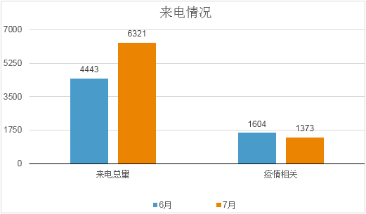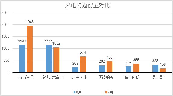 7月,随着疫情形势的好转和复工复产、复商复市政策的推行,12345企业热线的来电出现了两个显著变化:一是受理企业来电量显著增加,达6321次,来电总量环比上涨42.27%,创热线开通以来的最高值;二是与疫情相关来电占比回落,为1373次,占比21.72%,环比下降14.40%。