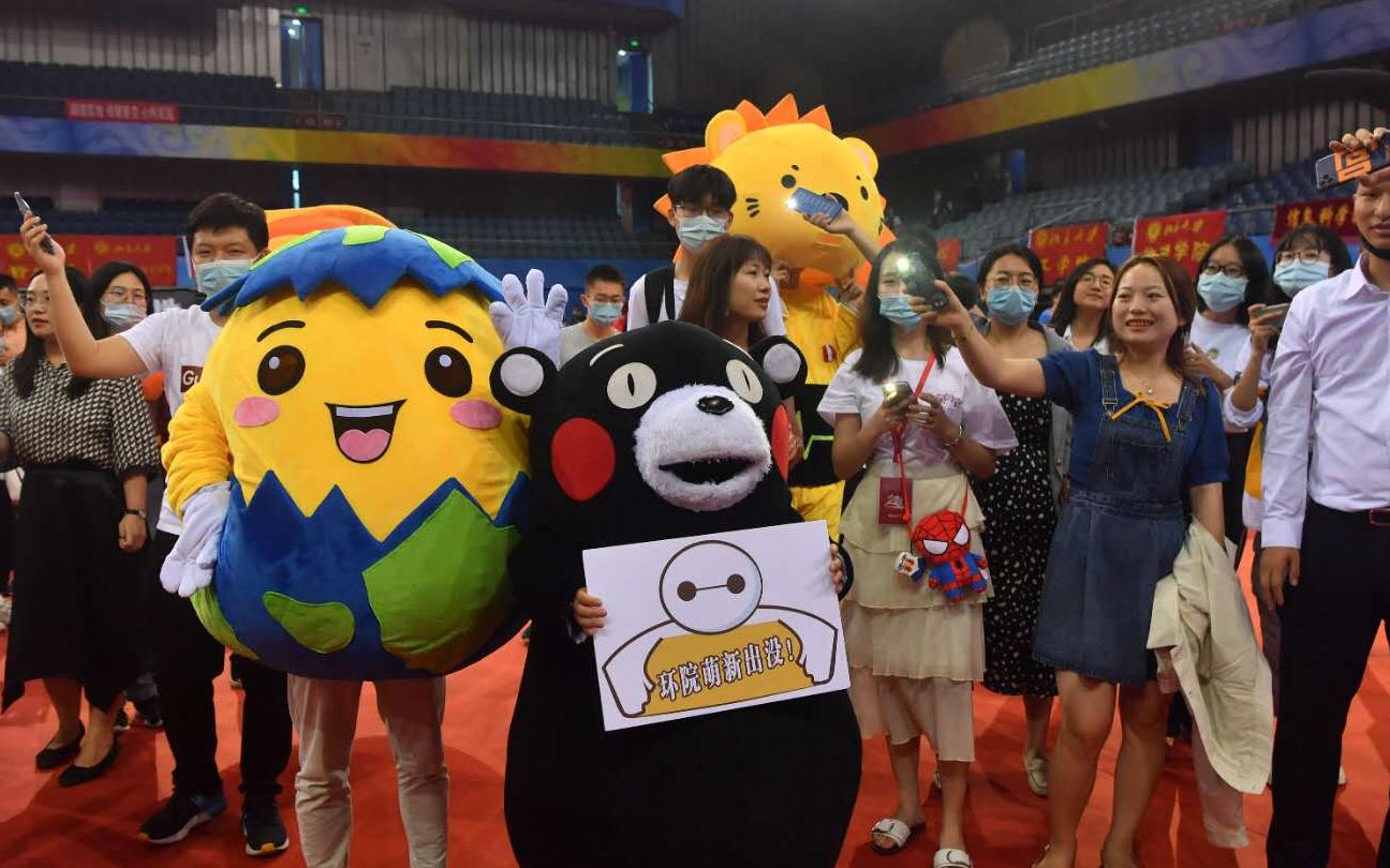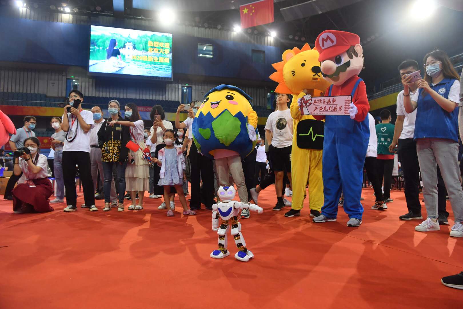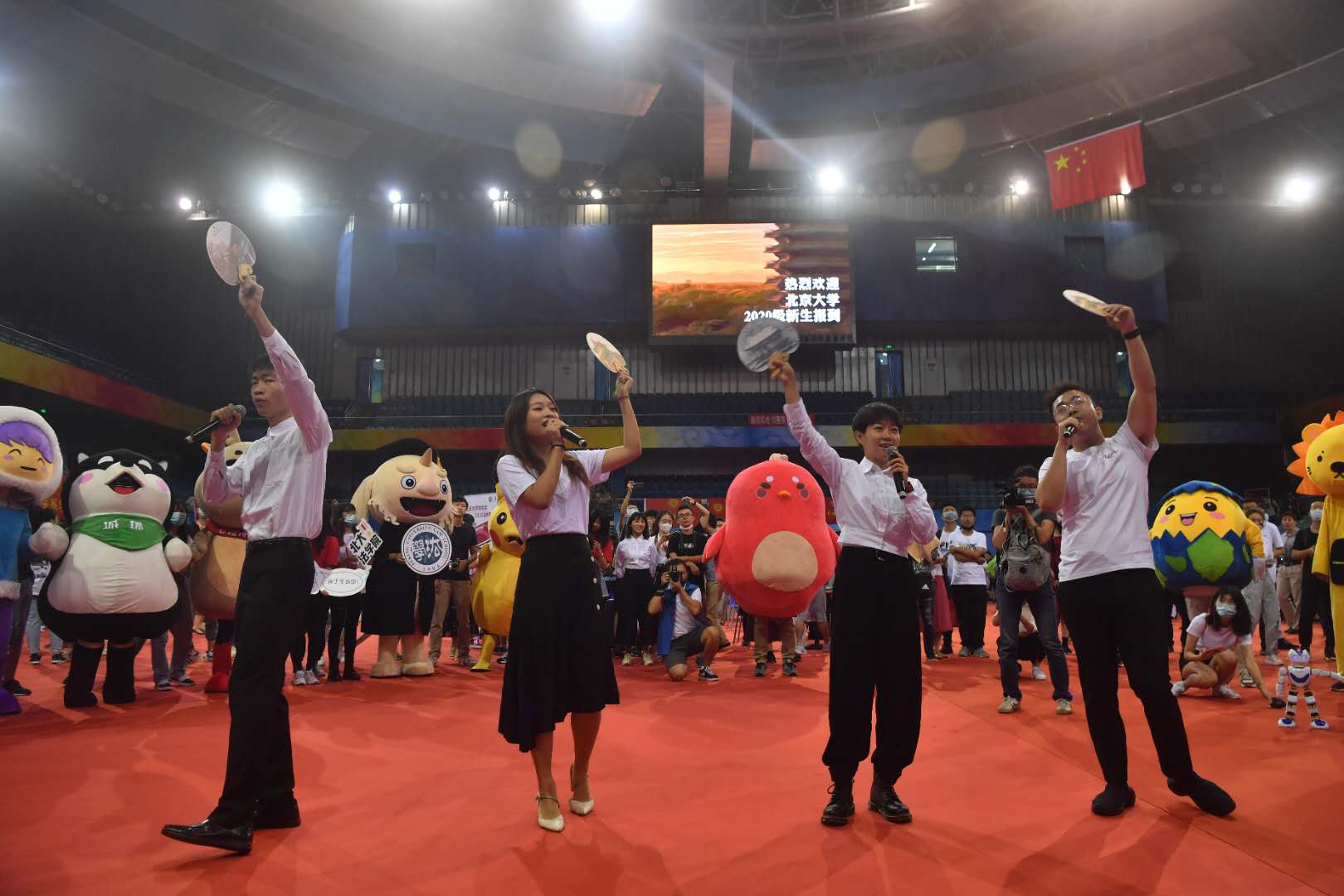 记者在现场看到,各学院的吉祥物排排站,参与快闪的同学们举起了开着手电筒的手机摇来摇去,还有的同学举着“I 爱CCME”“北大法学院”“我爱哲学”等不同学院的牌子。一位小朋友举着红旗开心地晃来晃去,还有一个机器人随着音乐“起舞”。