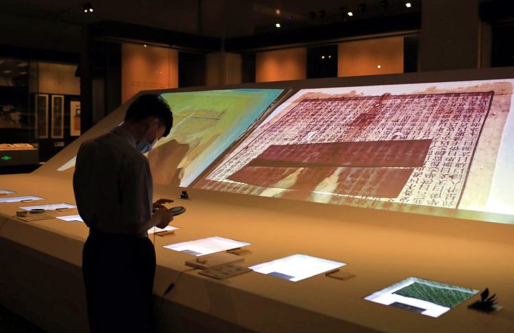 观众通过多媒体AR技术了解修复用纸知识。展览展出了修复竞赛作品和珍贵古籍修复成果共103册件,涵盖敦煌遗书、早期佛经、宋元善本、金石拓本、明清古籍、少数民族古籍等。同时,展示了古籍修复工具设备以及古籍修复用纸等实物。