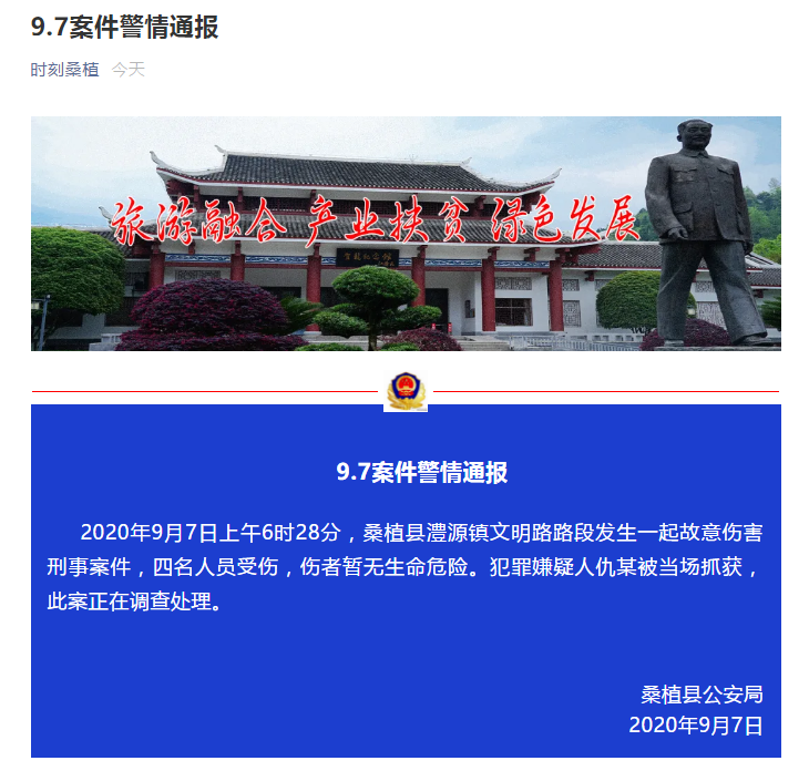 新京报快讯 据时刻桑植官微消息,9月7日上午6时28分,桑植县澧源镇文明路路段发生一起故意伤害案件,四名学生受伤,暂无人员死亡。犯罪嫌疑人仇某被当场抓获,此案正在调查处理。