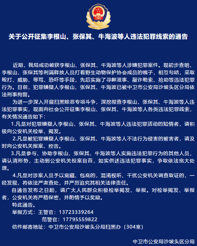 9月10日,中卫市公安局沙坡头区分局发布公告称,警方成功破获李根山、张保其、牛海波等人涉嫌犯罪案件。初步查明,李根山、张保其等刑满释放人员打着野生动物保护协会成员的幌子,相互勾结,采取殴打、威胁、辱骂、恐吓等手段,先后实施了寻衅滋事、敲诈勒索、抢劫等违法犯罪行为。目前,犯罪嫌疑人李根山等人已被警方依法刑事拘留。现面向社会公开征集李根山、张保其、牛海波等人各类违法犯罪线索。