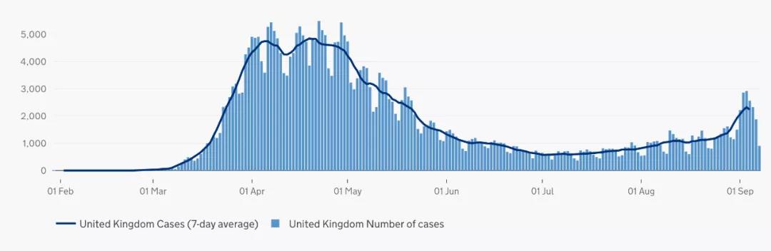 根据英国卫生部9月9日发布的消息,在过去24小时中,英国新增确诊病例2659例,这是英国连续第4天单日确诊病例超2000例。