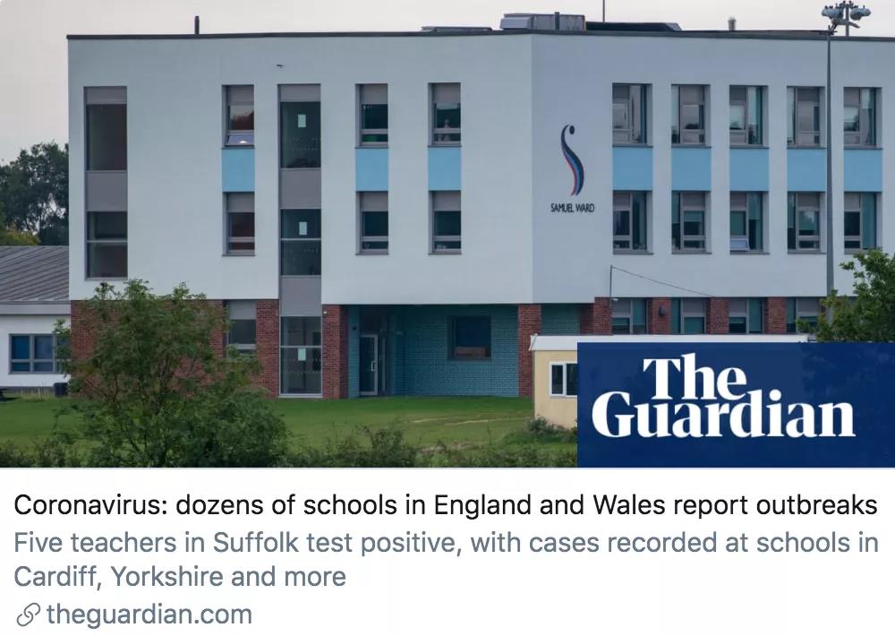英国英格兰和威尔士地区的数十所学校暴发校园疫情。《卫报》报道截图