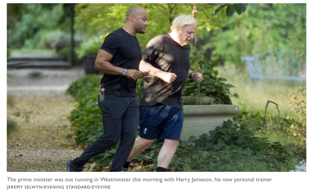 英国首相约翰逊与他的健身教练一起跑步。《泰晤士报》网站截图