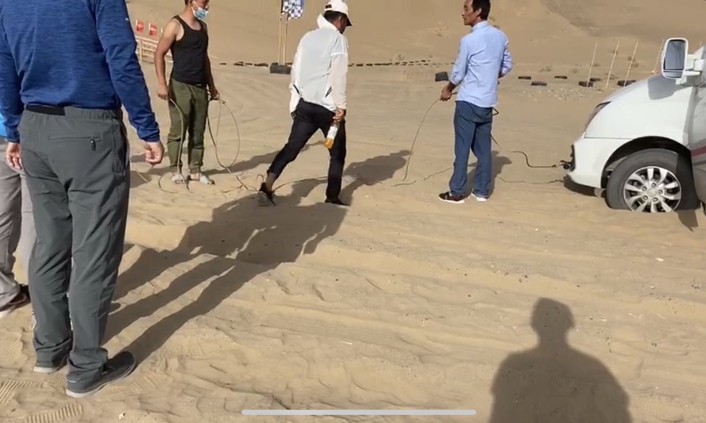 另一位曾在涉事“公厕”前陷车的游客薛先生表示,他也曾听到类似的话,“那家基地的工作人员告诉我,冲沙150元一人,如果玩就帮我免费拖车,而且沟通时态度很恶劣。”