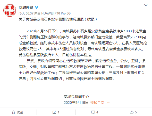 新京报快讯 据河南省信阳市商城县融媒体中心官方微博消息,2020年9月15日下午,商城县苏仙石乡距安徽省金寨县铁冲乡1000米处发生的货车侧翻掩压路边群众的事故,经商城县多部门全力救援,截至当天23:00完成全部救援。经对事故中伤亡人员核对核查,确认现场死亡2人,在县人民医院抢救无效死亡6人,其中有3人通过信息比对,最终确认是安徽省金寨县铁冲乡人。受伤送往县医院救治11人,目前伤情基本稳定。