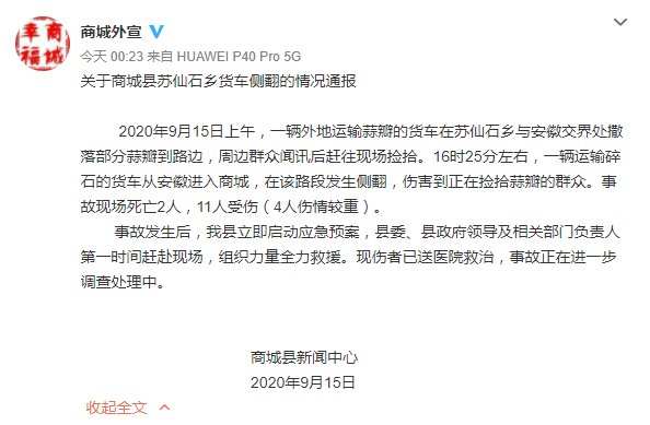 据此前通报,2020年9月15日上午,一辆外地运输蒜瓣的货车在苏仙石乡与安徽交界处撒落部分蒜瓣到路边,周边群众闻讯后赶往现场捡拾。16时25分左右,一辆运输碎石的货车从安徽进入商城,在该路段发生侧翻,伤害到正在捡拾蒜瓣的群众。事故现场死亡2人,11人受伤(4人伤情较重)。