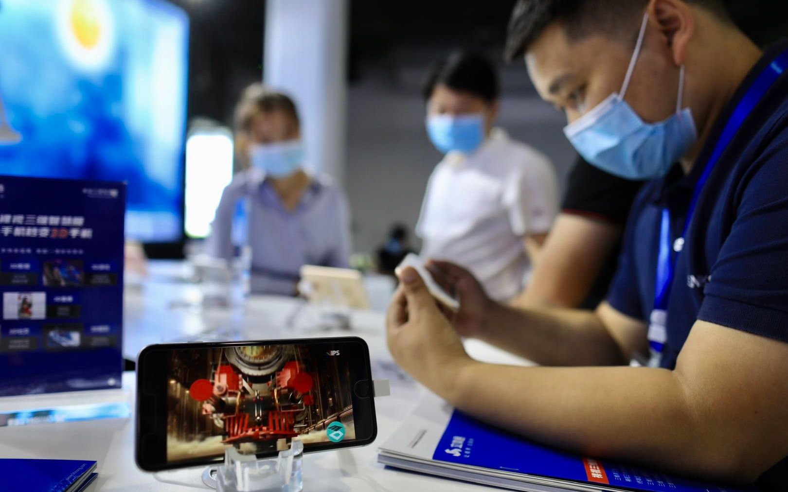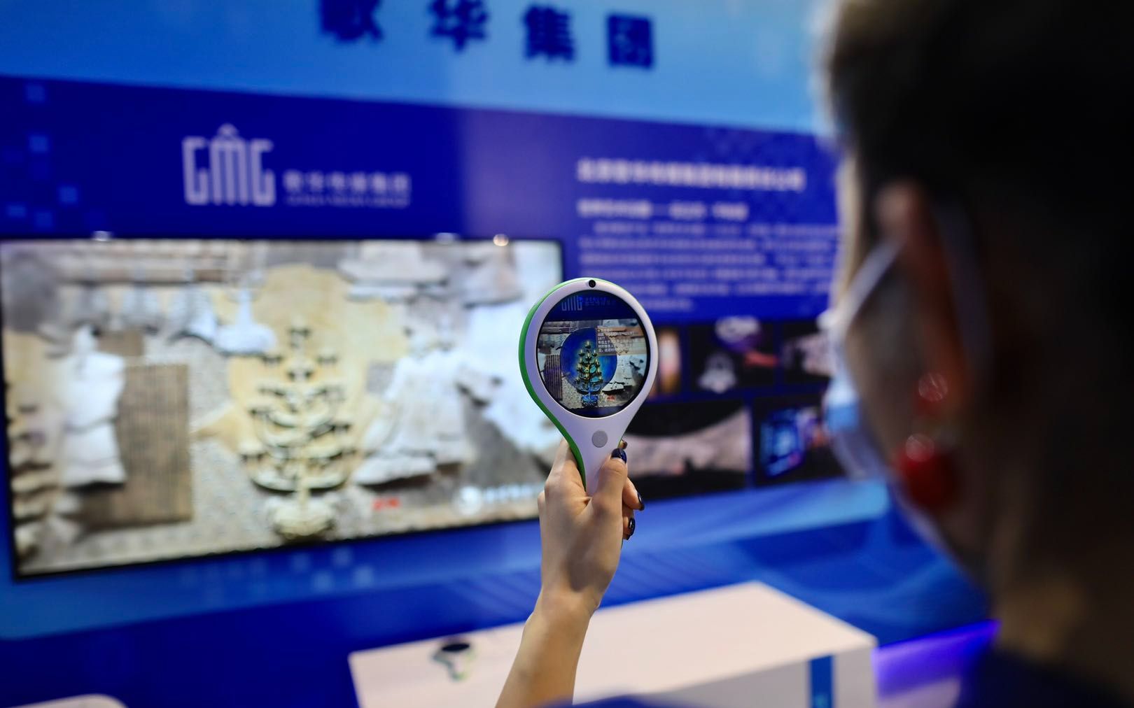 首都文化科技融合发展成果展区,观众利用“世界艺术云图——云立方·千秋颂”AR探究仪,观看展览讲解。摄影/新京报记者 浦峰