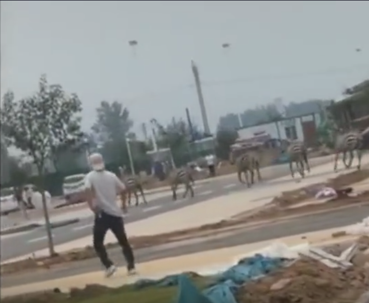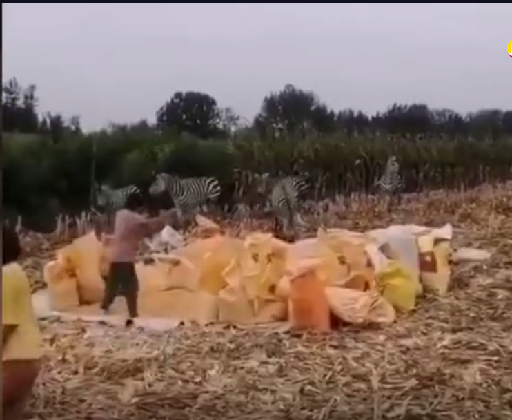 现场视频显示,五匹斑马结伴在马路上狂奔,途中啃食村民刚收的玉米棒子,饲养人员和村民在后围追堵截未果。