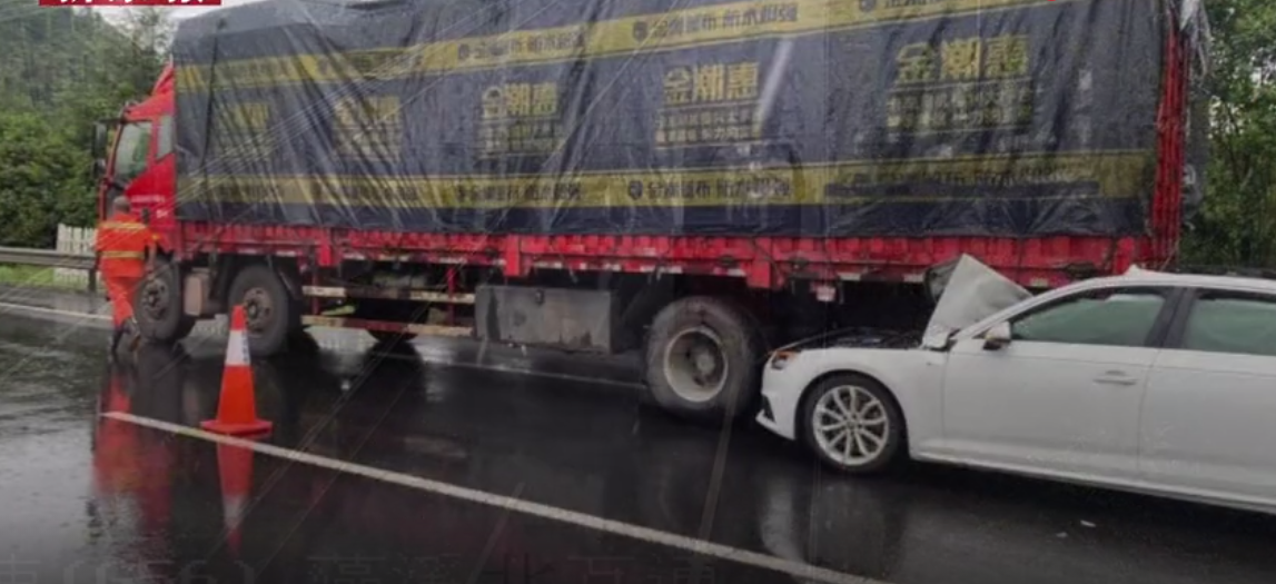 轿车雨天追尾货车被拖行百米,车内3人死里逃生