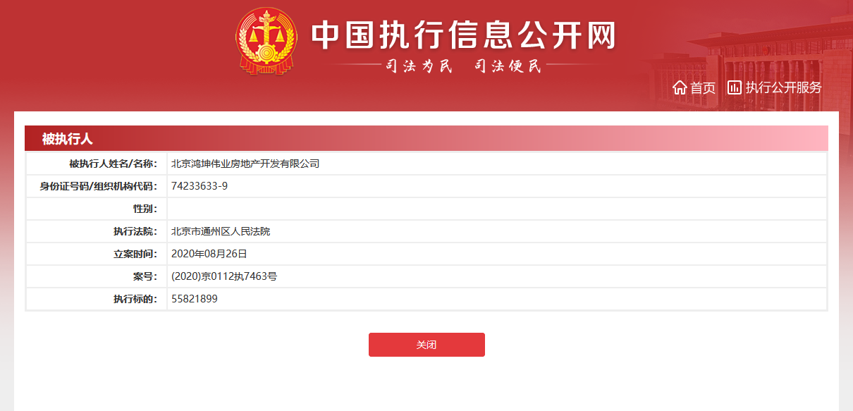 新京报贝壳财经此前报道,据中国执行信息公开网,鸿坤地产被列为“被执行人”,立案时间为2020年8月26日,案号为(2020)京0112执7463号,执行标的为55821899元。