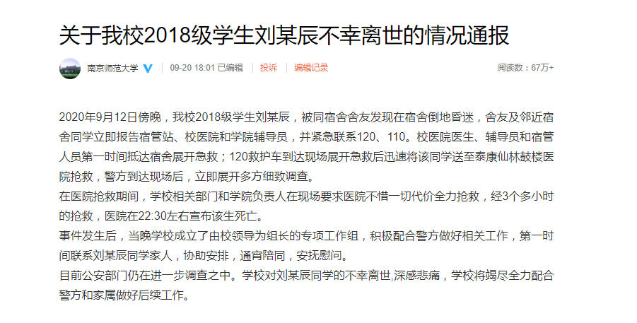 2020年9月12日傍晚,我校2018级学生刘某辰,被同宿舍舍友发现在宿舍倒地昏迷,舍友及邻近宿舍同学立即报告宿管站、校医院和学院辅导员,并紧急联系120、110。校医院医生、辅导员和宿管人员第一时间抵达宿舍展开急救;120救护车到达现场展开急救后迅速将该同学送至泰康仙林鼓楼医院抢救,警方到达现场后,立即展开多方细致调查。