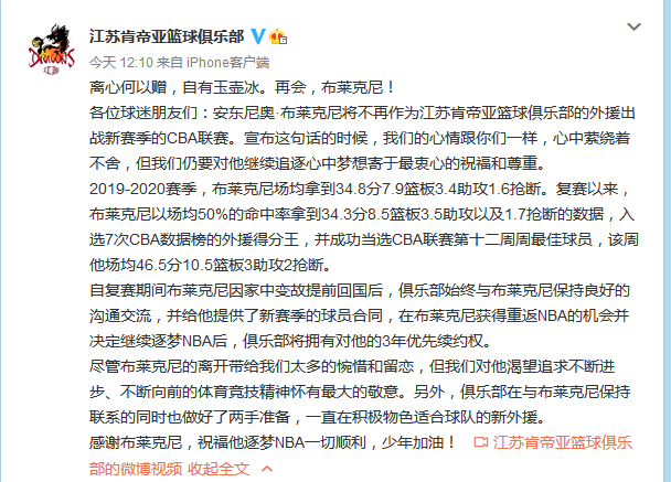 各位球迷朋友们:安东尼奥·布莱克尼将不再作为江苏肯帝亚篮球俱乐部的外援出战新赛季的CBA联赛。宣布这句话的时候,我们的心情跟你们一样,心中萦绕着不舍,但我们仍要对他继续追逐心中梦想寄于最衷心的祝福和尊重。