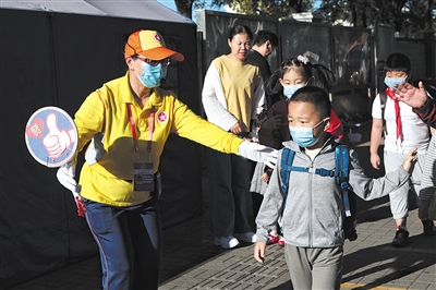 9月16日,顺义区双兴小学门口,志愿者引导学生安全步行。