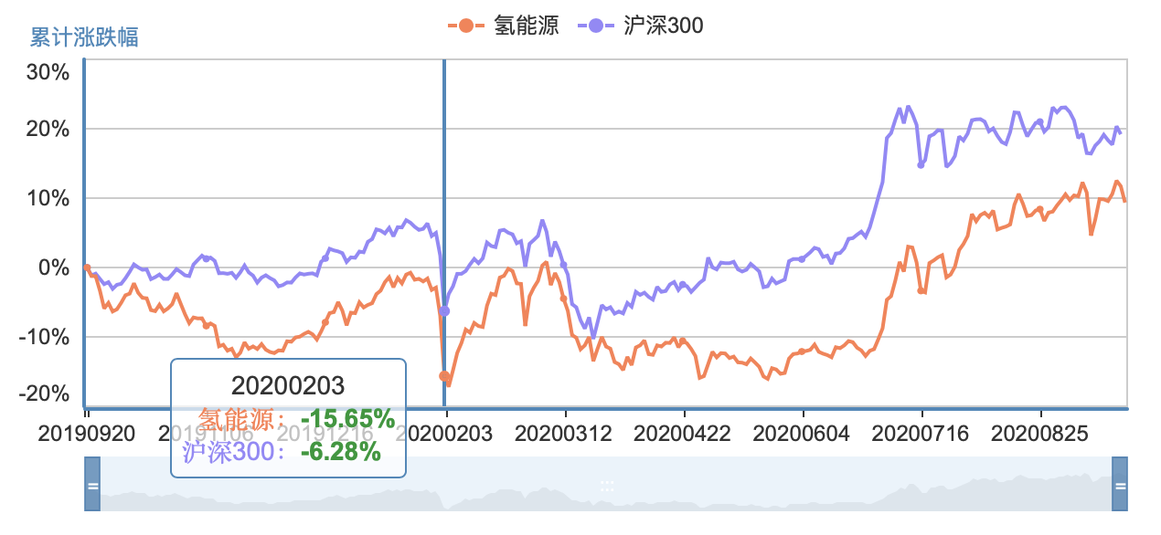 新京报贝壳财经记者注意到,早在2019年9月初至今年1月末,氢燃料概念股曾经历10%左右涨幅的高光时刻,不过,此后整体股价大跌,2月3日单日整体跌幅就达到15.65%。