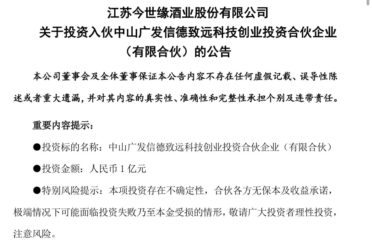 新京报讯(记者 郑明珠)今世缘9月23日晚发布公告称,为借助专业投资机构拓宽公司对外投资渠道,江苏今世缘酒业股份有限公司通过全资子公司江苏今世缘投资管理有限公司(简称“今世缘投资”)投资入伙“中山广发信德致远科技创业投资合伙企业(有限合伙)”(简称“广发致远科技”)。