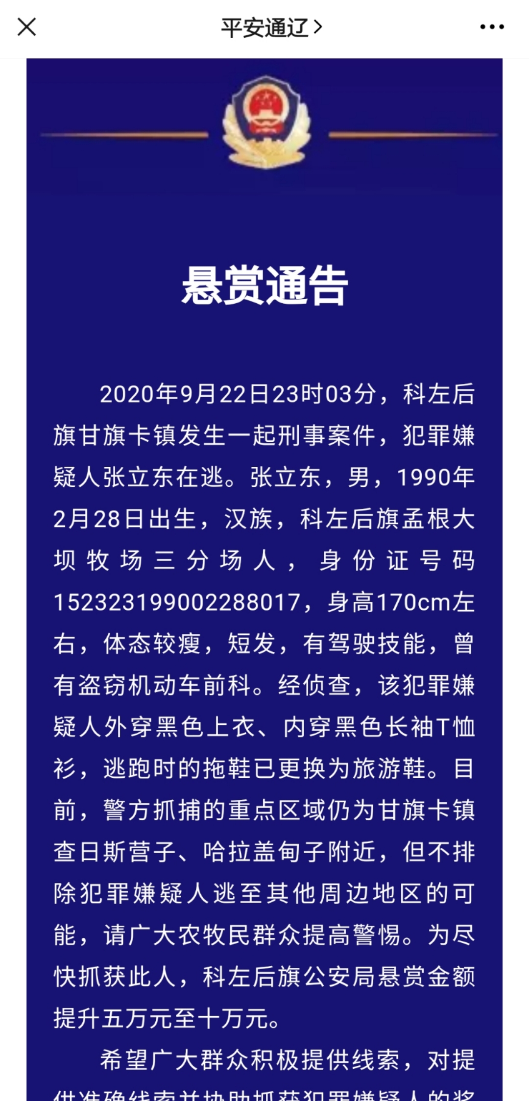 新京报讯(记者 刘瑞明 实习生 郑雪婧)9月22日23时03分,内蒙古通辽市科左后旗甘旗卡镇发生一起刑事案件,犯罪嫌疑人张立东抢劫财物后逃跑。23日,当地警方发布悬赏通告,悬赏5万元,24日悬赏金额提至10万元。负责征集线索的倪警官告诉新京报记者,此人有犯罪前科,本次抢劫系出狱后再次作案。