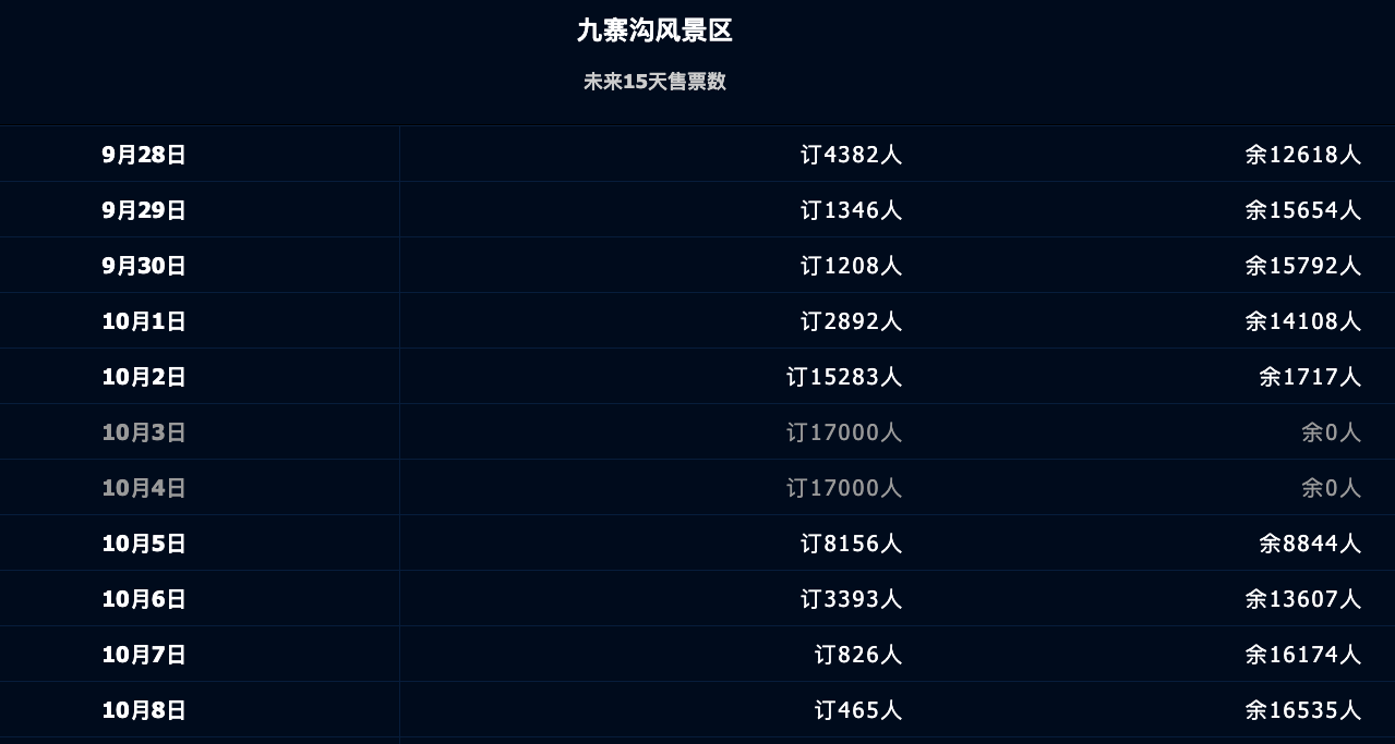 九寨沟景区实行全网实名制购验票,现场不设购票窗口。十一黄金周前,景区部分区域开园门票、车票执行旺季价格,其中,门票为169元/人,观光车票为90元/人。新京报记者从九寨沟景区官网获悉,截至目前,九寨沟景区10月3日至4日的门票已售罄,10月2日和10月5日的门票不足一万张,十一黄金周其他日期的门票剩余还较多。