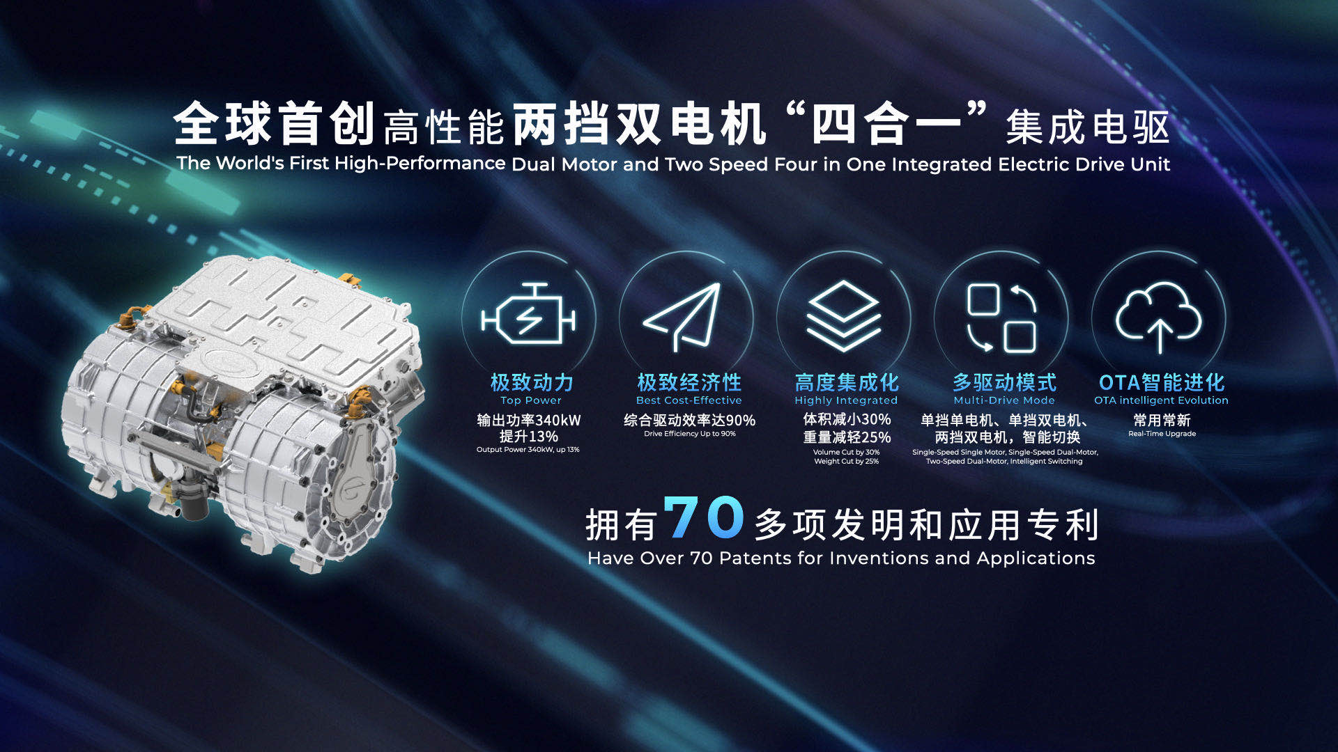 广汽新能源则发布全球首创高性能两挡双电机“四合一”集成电驱。通过双电机+控制器+两挡减速器深度集成,在“三合一”电驱基础上实现再次升级,带来340KW狂暴动力性能和高达90%综合驱动效率,功率提升13%的同时,体积减小30%,重量减轻25%,并拥有多种驱动模式和OTA智能进化等技术优势。