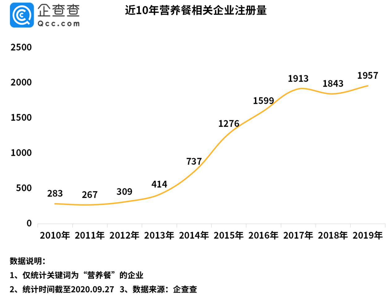 企查查数据显示,近10年全国营养餐相关企业注册量逐年攀升,2010年-2013年平均注册量达318家,2014年起市场发展速度加快。2019年新注册量达1957家,同比上升6.2%,比10年前数据上升6倍。