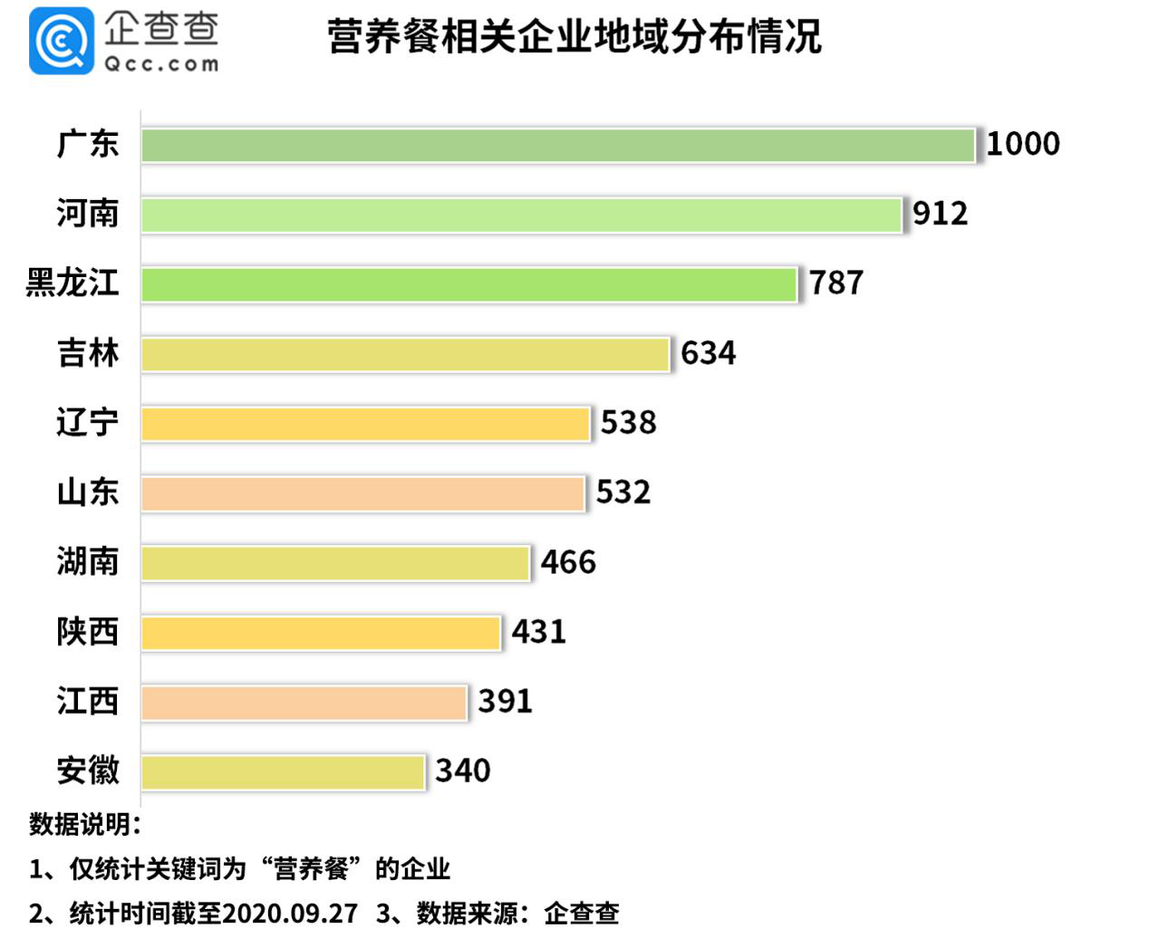 从地域分布来看,企查查数据显示,广东省拥有的营养餐相关企业数量最多,达1000家,河南省以912家紧随其后,排名第二,黑龙江省、吉林省分别以787家和634家排名三、四位。
