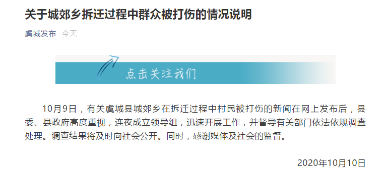 10月9日,有关虞城县城郊乡在拆迁过程中村民被打伤的新闻在网上发布后,县委、县政府高度重视,连夜成立领导组,迅速开展工作,并督导有关部门依法依规调查处理。调查结果将及时向社会公开。同时,感谢媒体及社会的监督。