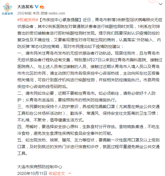 二、请市民如非必要,近期不要前往青岛市。如必须前往,请务必做好个人防护;从青岛市返连后,要按照我市的相关防控措施执行。