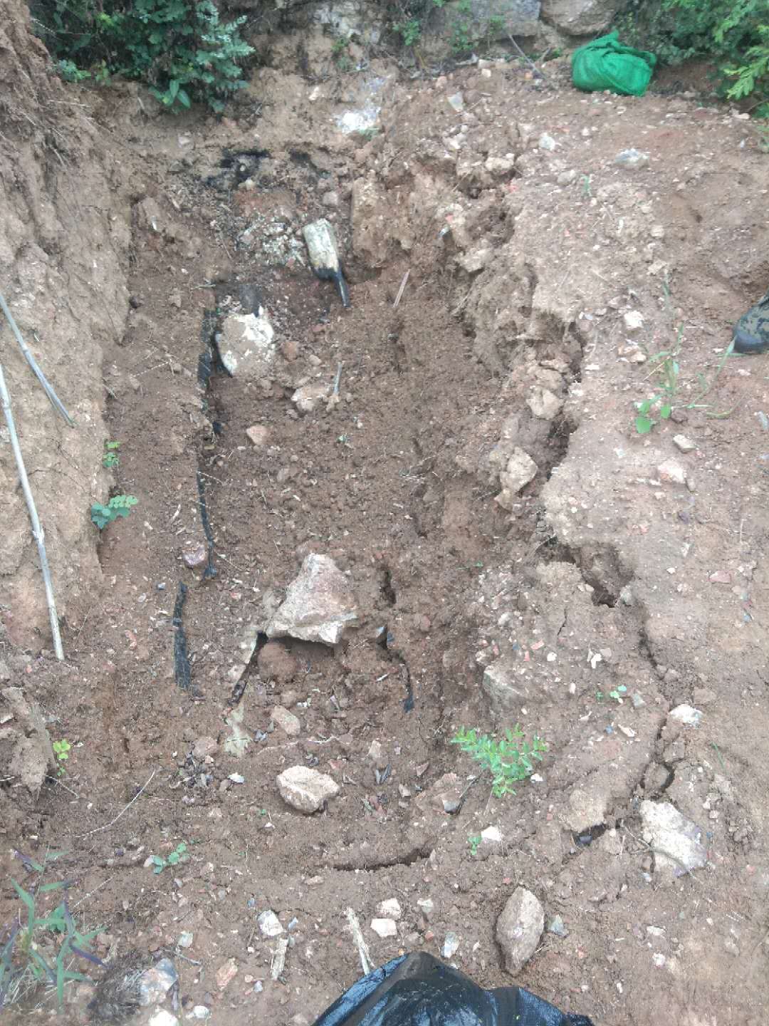 今年9月8日,王玉奎的亲戚上山打枣时,发现王希恩的坟墓被掘开,且有焚烧痕迹。在王玉奎提供的其父墓穴照片中可以看到,一个土坑中散落着碎石和泥巴,边缘露出一层黑黝黝的框架。王玉奎称,这是被焚烧后棺椁的残骸。