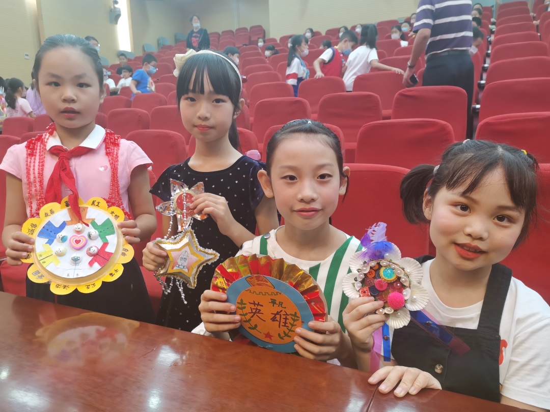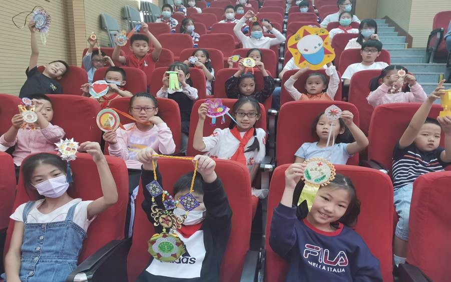 一(4)班胡宝文同学用金色月饼盒裁剪出奖杯形状,用红色的蛋糕包装带裁剪出彩带,还用巧克力的金色包装纸装饰了废旧酒瓶盖,制作了一枚奖杯勋章,她把这枚勋章献给消防员,她的爸爸就是其中一员。 一(1)班张煦恩同学的妈妈参加了此次国家援鄂抗疫医疗队,支援武汉同济医院中法新城院区ICU病房。她也是景山学校1999届的高中毕业生。在这次配饰节上,她与孩子们分享了她的《抗疫日记》,讲述白衣天使们不顾安危,抢救病人的感人故事。