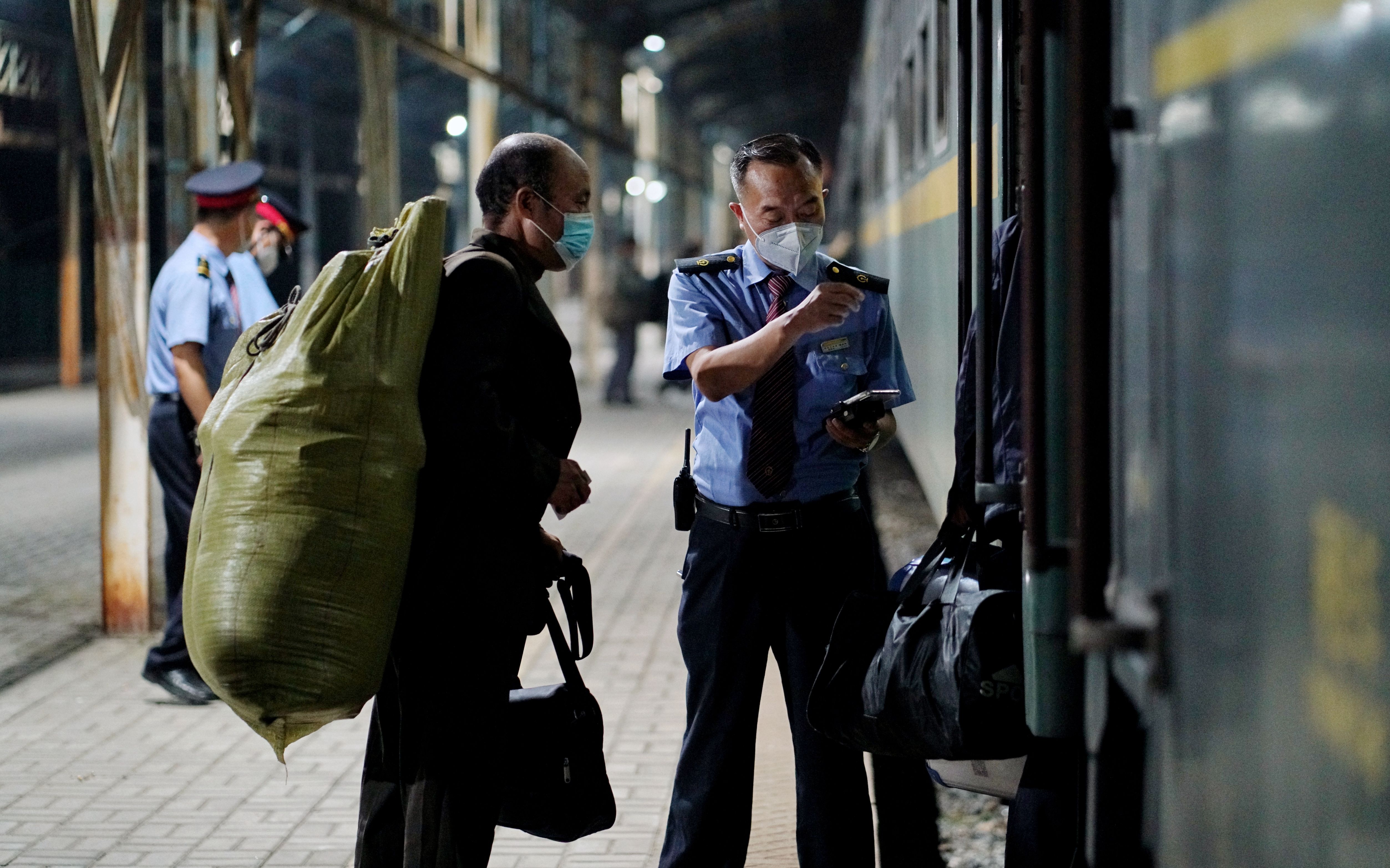 夜晚,6437次列车停靠在中途车站,上车乘客多为沿线村庄务工人员。摄影/新京报记者 裴剑飞