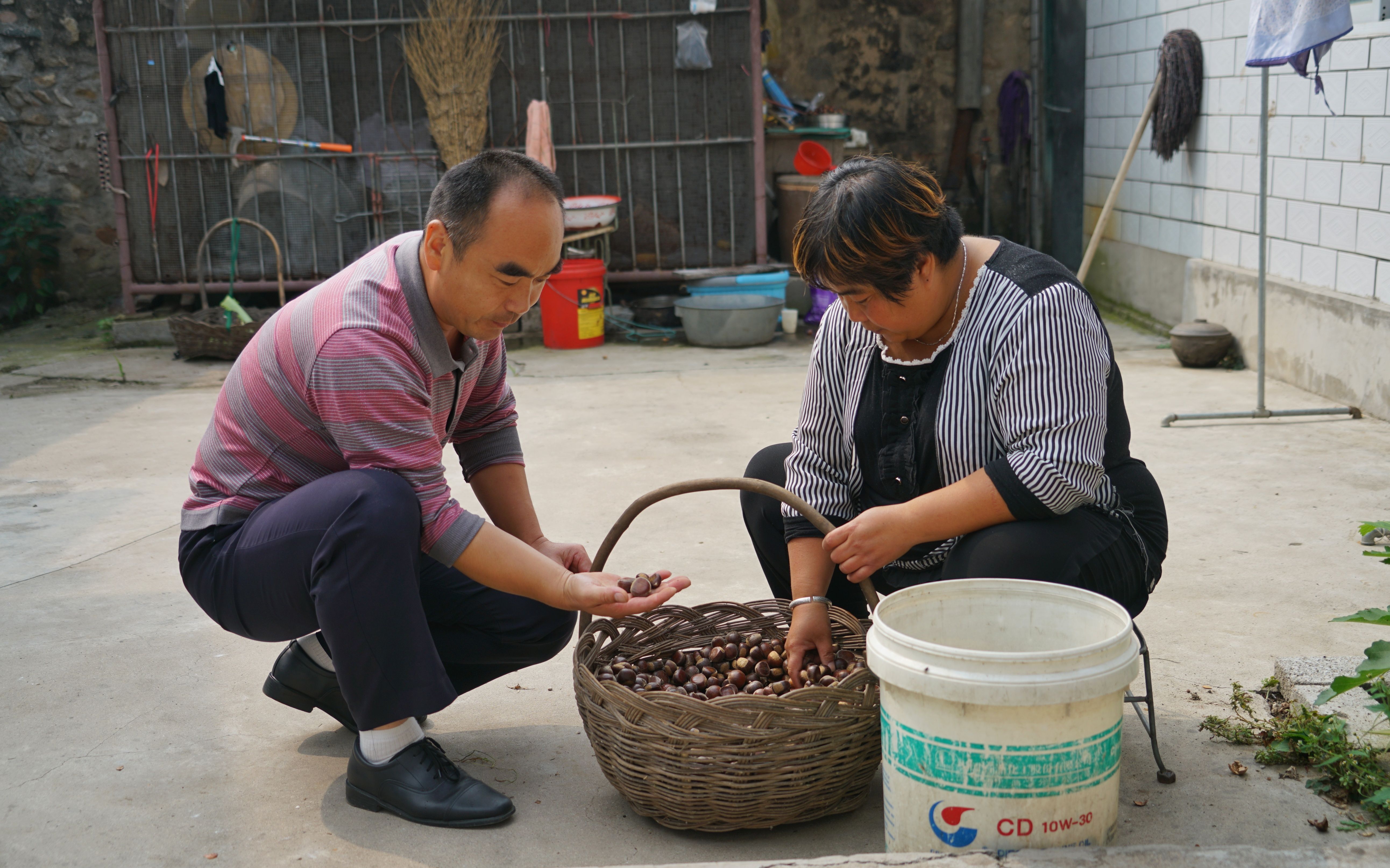 北京铁路局驻村扶贫干部(左)帮助村民挑选板栗。摄影/新京报记者 裴剑飞